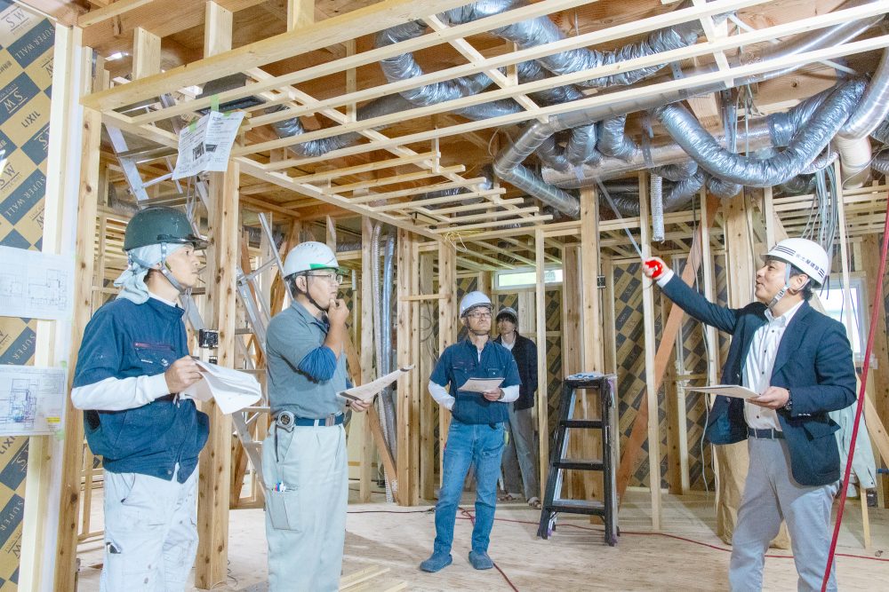 中野市の㈱土屋建設、矢嶋建築㈱、須坂市の須坂土建工業㈱、村山建設㈱、小布施町の冨岡建設㈱、飯綱町の田中建築㈱の6社によるプロジェクト「家ッス!信州」(会長・土屋徹㈱土屋建設社長)は13日、中野市栗和田に建設中の合同住宅展示場で構造見学会を開いた。完成度が3〜4割に達した3社の住宅を、参加企業同士で見学した。