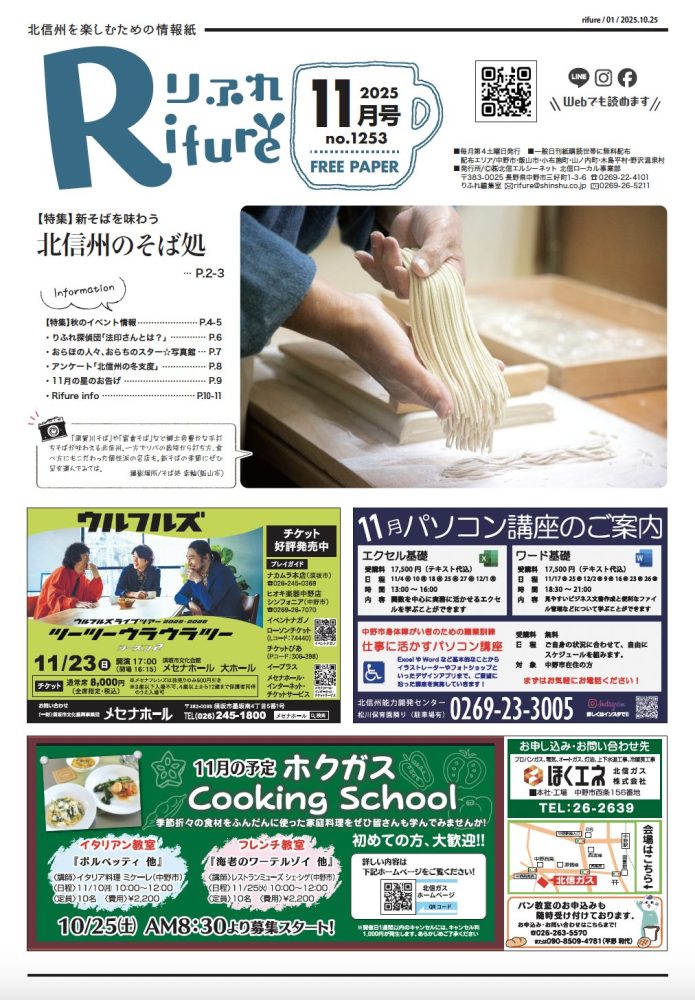 2025年10月25日 / 最終更新日時 : 2025年10月23日 admin りふれ りふれ10月号 本日発行 サイトはこちら 北信州を楽しむための情報紙「りふれ」は第4土曜日に日刊紙といっしょにフリーペーパーとしてお届けしています。 お近くのスーパー、コンビニエンスストアなどにもフリーペーパーとして配置しています。 FacebookXBluesky