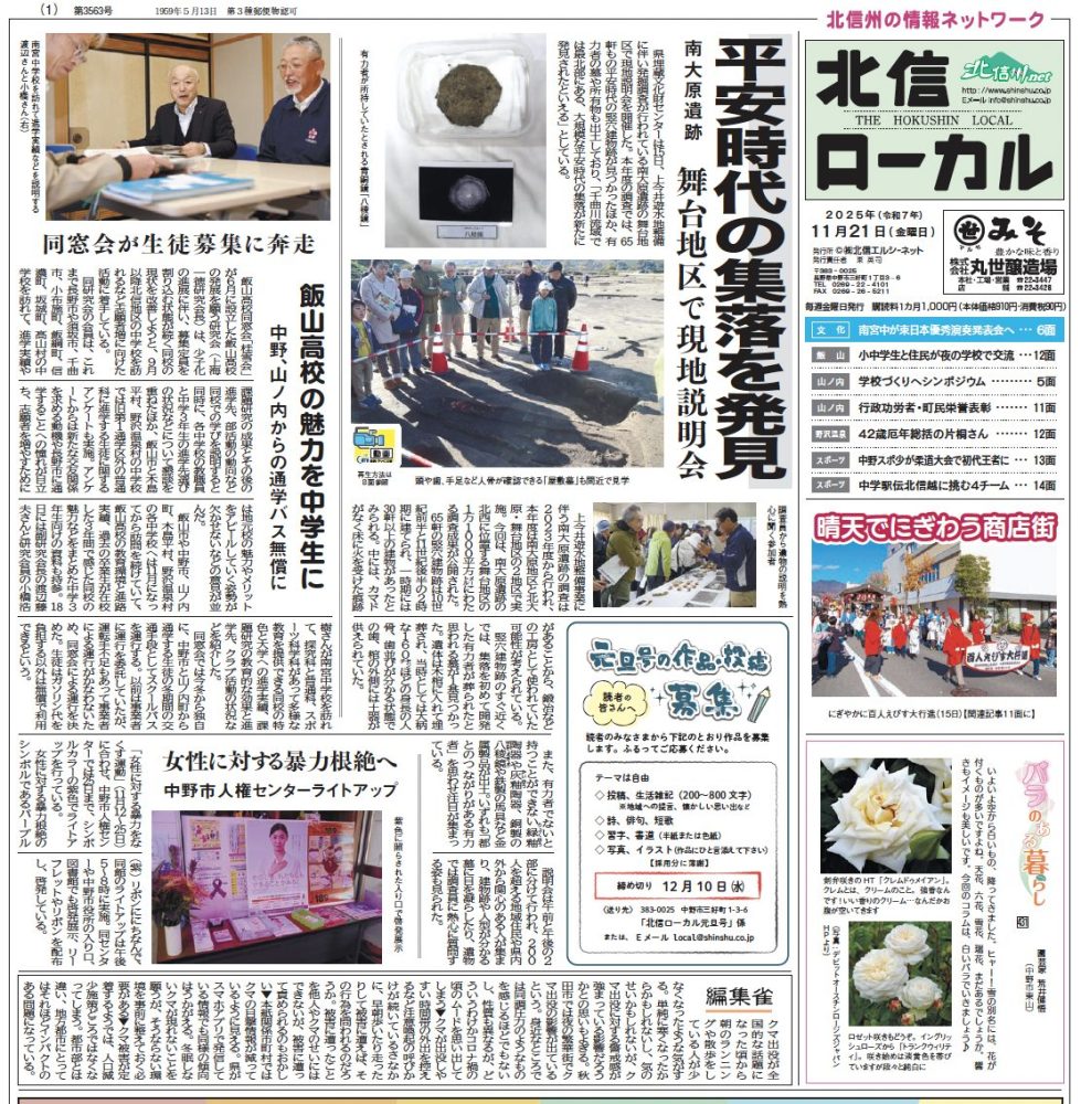 2025年11月21日 / 最終更新日時 : 2025年11月20日 admin 北信ローカル〜今週のインデックス〜 北信ローカル 本日発行 中野市、山ノ内町、小布施町、飯山市、木島平村、野沢温泉村、お近くのコンビニエンスストアでも販売しています。 FacebookXBluesky