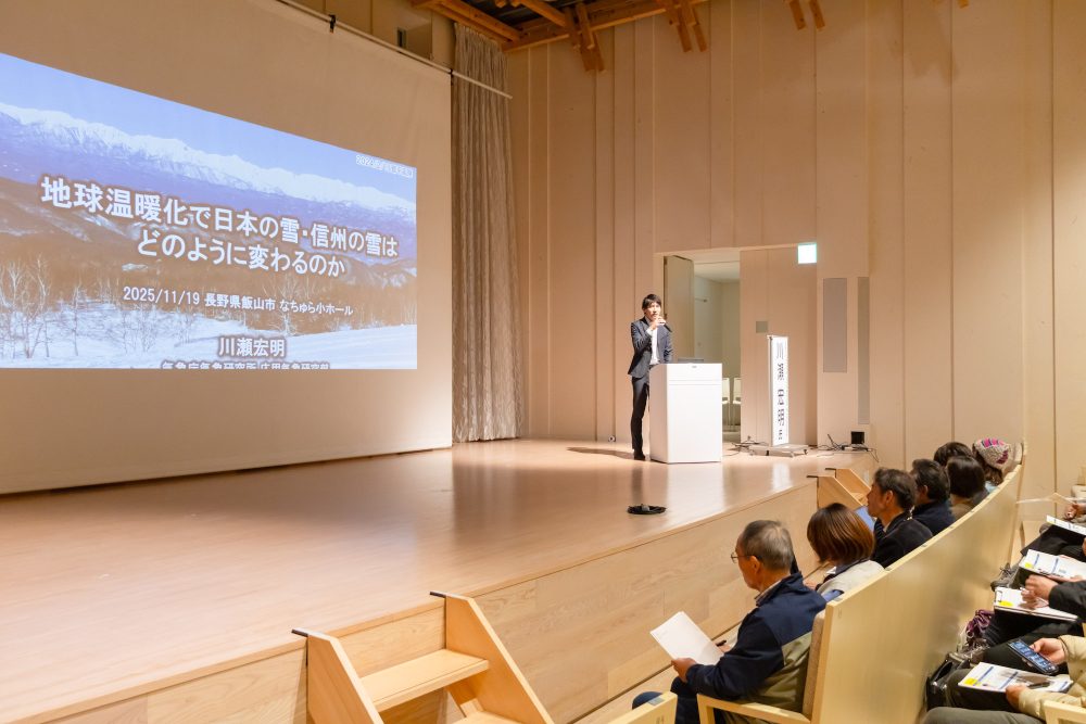 「雪」をキーワードにゼロカーボン社会の実現と北信州の将来を考えるイベント「ゼロカーボンミーティング2025in北信州 地球温暖化と雪~どうなる?北信州の雪と暮らし~」が19日、飯山市文化交流館なちゅら小ホールで開催され、約90人が参加した。