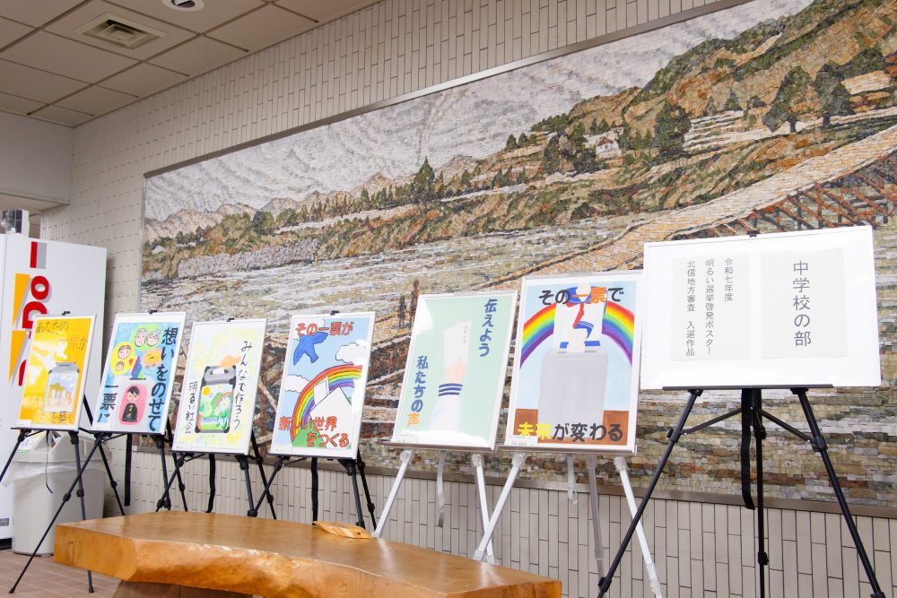 2025年11月29日 / 最終更新日時 : 2025年11月27日 admin 中野市 北信合同庁舎ロビーで展示 明るい選挙啓発ポスターコンクール入賞作品が12月5日まで北信合同庁舎ロビーに展示されている。28日までが中学校の部6点、12月1日からが小学校の部14点が並ぶ。 FacebookXBluesky