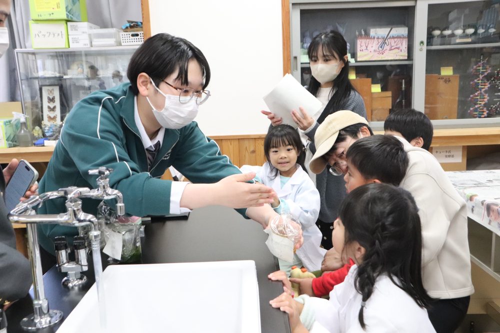 科学の原理や応用を生かした実験体験「わくわくサイエンス教室」が開かれ、同校探究科1年生や自然科学部の生徒が講師となり、さまざまな企画を用意した。