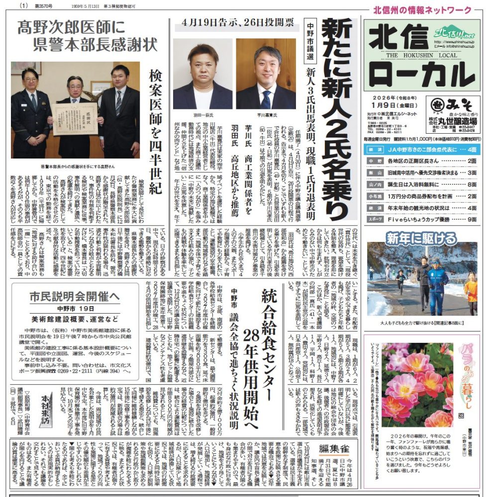 2026年1月9日 / 最終更新日時 : 2026年1月8日 admin 北信ローカル〜今週のインデックス〜 北信ローカル 本日発行 中野市、山ノ内町、小布施町、飯山市、木島平村、野沢温泉村、お近くのコンビニエンスストアでも販売しています。 FacebookXBluesky