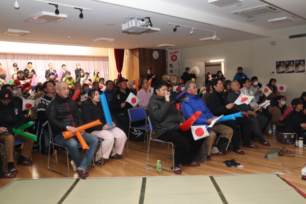 ミラノ・コルティナ冬季五輪のジャンプ女子ノーマルヒルで、野沢温泉村出身の丸山希選手が、日本勢第1号となる銅メダルを獲得した。同村では8日未明、村公民館でパブリックビューイング(PV)が開かれ、村民約100人が駆けつけ、伸びやかで美しいジャンプに大歓声と拍手喝さいを送った。