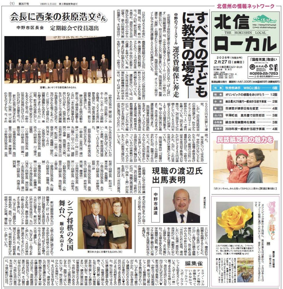 2026年2月27日 / 最終更新日時 : 2026年2月26日 admin 北信ローカル〜今週のインデックス〜 北信ローカル 本日発行 中野市、山ノ内町、小布施町、飯山市、木島平村、野沢温泉村、お近くのコンビニエンスストアでも販売しています。 FacebookXBluesky