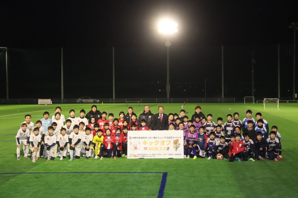 2026年3月8日 / 最終更新日時 : 2026年3月5日 admin 中野市 中野市多目的サッカー場リニューアル 中野市多目的サッカー場の人工芝張り替え工事と照明のLED化完了を記念し、市内の小学生サッカー3チームを招待してのイベントが3日夜、開催された。 FacebookXBluesky