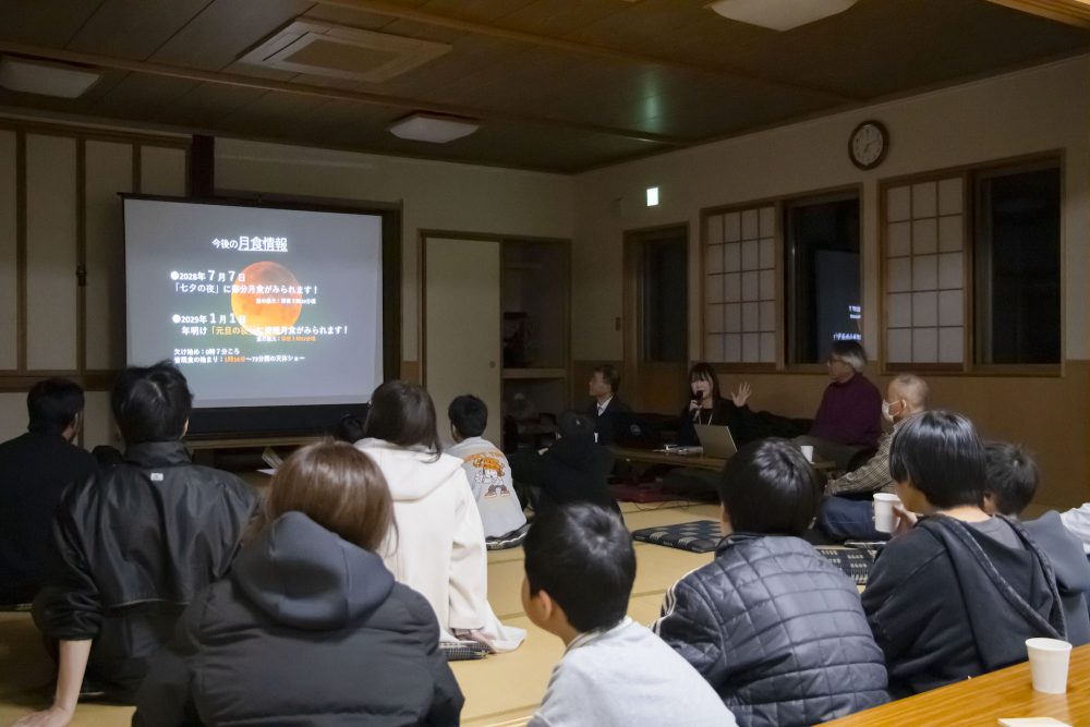 「ひな祭りにみんなで皆既月食と星空を見よう!」が3日、中野市の東江部公民館で開かれた。当日はあいにくの天気で、目当ての赤銅色の満月は観測できなかったものの、親子連れなど約40人が、市立博物館プラネタリウム解説員の関まゆみさんによる月食や星空の解説を楽しんだ。